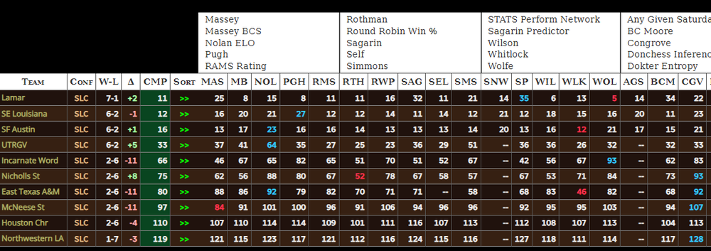 13. We are 14 in both of the two polls that are likely the most respected in the FSC Poll stratosphere. To Gator's point, an 11-1 LU with wins over SFA & SELA will likely be a top ten team and would get a home game. It would also be the most historic, IMHO, regular season for Lamar Football! But I am getting ahead of myself. Only focusing on this weeks game in San Antonio. 😎
